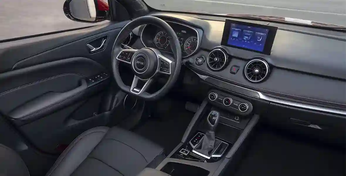 Интерьер нового кроссовера отличается выверенной эргономикой в классическом европейском стиле и особой элегантностью благодаря высококачественным материалам отделки и эффектным элементам оформления – в частности, похожим на воздухозаборники турбин дефлекторам вентиляции или декоративным вставкам дверей. Мультифункциональный руль D-образной формы со срезанным нижним сегментом и сиденья DFSK 500 обшиты высококачественной экокожей с перфорацией. Кресло водителя регулируется в шести направлениях, кресло переднего пассажира – в четырех.